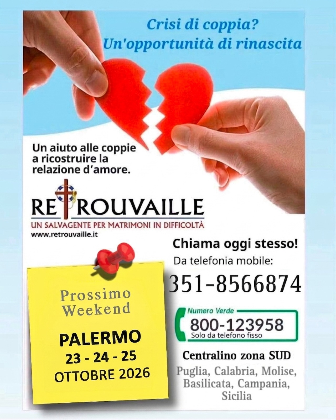 Crisi di coppia? Retrouvaille è un’opportunità per attraversare questa fase, un aiuto concreto per ricostruire la relazione d’amore. A Palermo nel prossimo autunno.